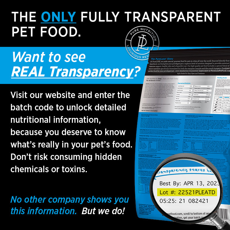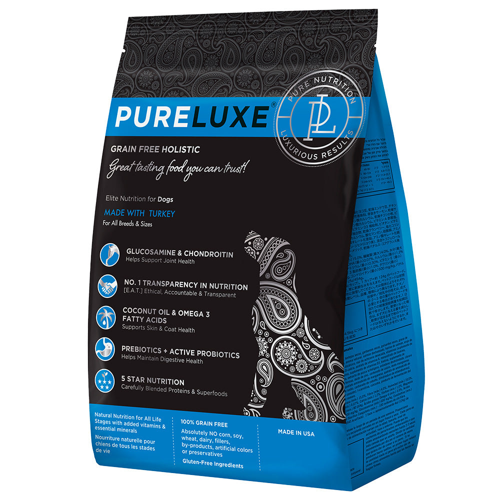 Treat your loyal companion to Pureluxe Elite Nutrition Grain-Free Turkey Dry Dog Food. This formula is perfect for dogs who strive to be in top condition while lounging on the couch or going for a run. With real turkey as the first ingredient, this high-protein and low-glycemic food is packed with essential nutrients like omega-3 fatty acids, pre and probiotics, and coconut oil to keep your dog looking and feeling their best. You can rotate this formula with Elite Nutrition Lamb and Salmon options (sold separately) for added variety. And with Pureluxe’s Nutritional Transparency, you can enter the code on the back of any bag into their website and see exactly what goes into their kibble. From cook percentage to heavy metal content, you’ll get everything you need to make a smart dietary decision for your pup.