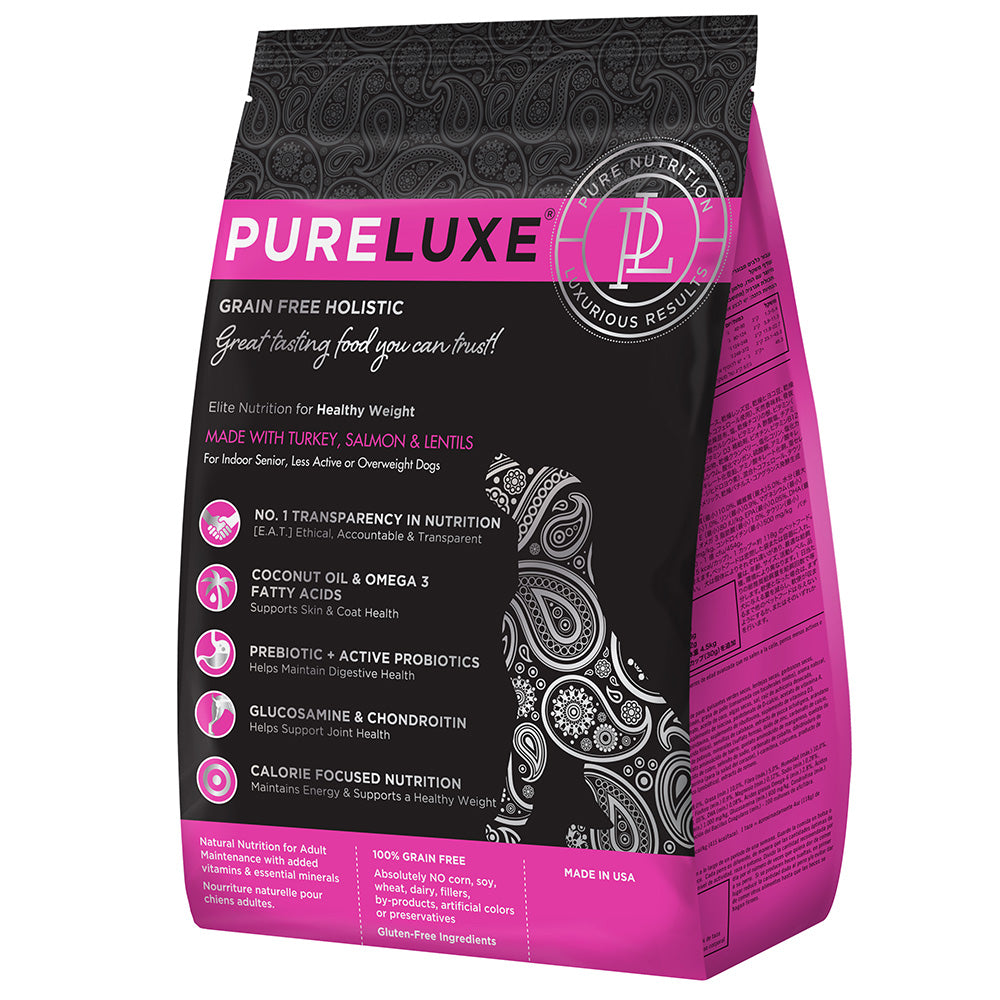 Give your furry friend the gift of a healthy weight with Pureluxe Elite Nutrition Grain-Free Turkey, Salmon & Lentils Dry Dog Food. This formula is perfect for adult, senior, or special needs dogs who may be less active or starting to gain weight around the mid-section. The first ingredient is fresh turkey, followed by other high-quality ingredients, with absolutely no fillers, dairy, by-products, or artificial additives. Plus, the low-glycemic formula helps your pet burn fat evenly, whether they’re lounging on the sofa or playing in the park. With added pre and probiotics, as well as L-carnitine, this food helps maintain regular stools and keep the weight off. And for complete transparency, simply input the code on the back of the bag into Pureluxe’s website to see detailed reports on their ingredients and cooking process.
